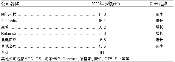 從目前市場情況來看,美國的固定網(wǎng)OSS服務(wù)保障的市場集中度相當(dāng)高。在市場中領(lǐng)先的公司一共有5家,它們分別是朗訊科技、Telcordia科技、惠普公司、Hekimian和北電網(wǎng)絡(luò)。這五家公司均是較早進入這一市場的老牌公司。2000年,它們在固定網(wǎng)OSS服務(wù)保障領(lǐng)域的銷售額總和為8.60億美元,約占整個市場的56.5%左右,另外43.5%的市場被約其他二十多家廠商分割。