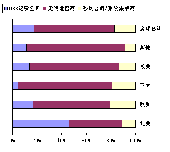 圖1、無線OSS計費(fèi)市場:2000年全球按照地區(qū)劃分的不同公司類型的整體市場收入估計(百萬美元)