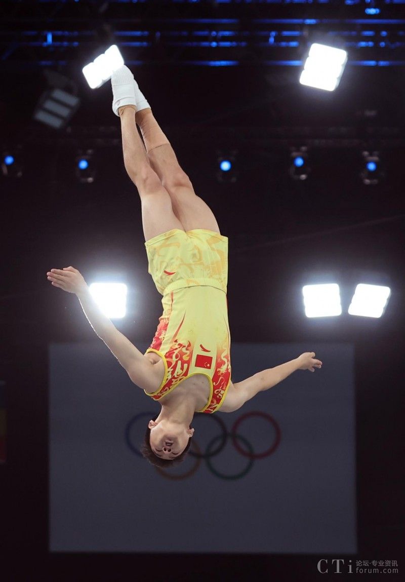 8月2日,中國選手王梓賽在比賽中。當日,巴黎奧運會蹦床項目男子預(yù)賽在貝爾西體育館舉行。新華社記者 曹燦 攝